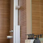 Arbetsbord, plattskärms-TV med satellitkanaler och brandvarnare samt kaffe/tebryggare, kylskåp och ugn finns också här. Separat toalett och dusch finns här.